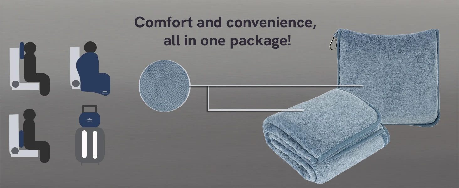 Airplane Throw Warm Blanket, Machine Washable: Our plane blanket comes rolled up in a matching soft grayish blue-colored plush travel bag/pillowcase, making it portable while traveling. Best of all, both the travel blanket and zipper travel case are washer- and dryer-safe.