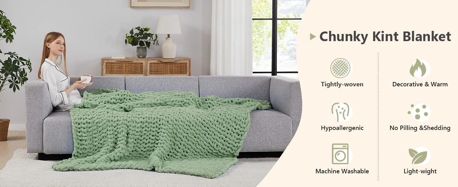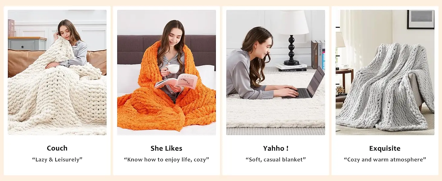 Chenille Chunky Knit Blanket: Our cable knit blanket offers a variety of sizes and colors for you to choose from. The smallest size chunky crochet blanket can be used for kids and pets, and the large size knitted blanket chunky is suitable for adult use