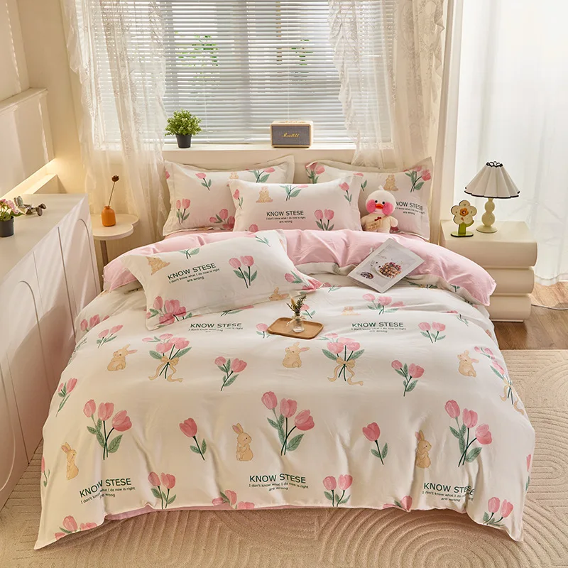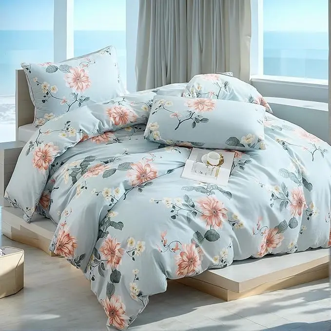 Floral Duvet Cover Sets Cotton 4Pieces French Country Chic Garden Style Luxury Blossom Floral Reversible Pattern Bedding Sets