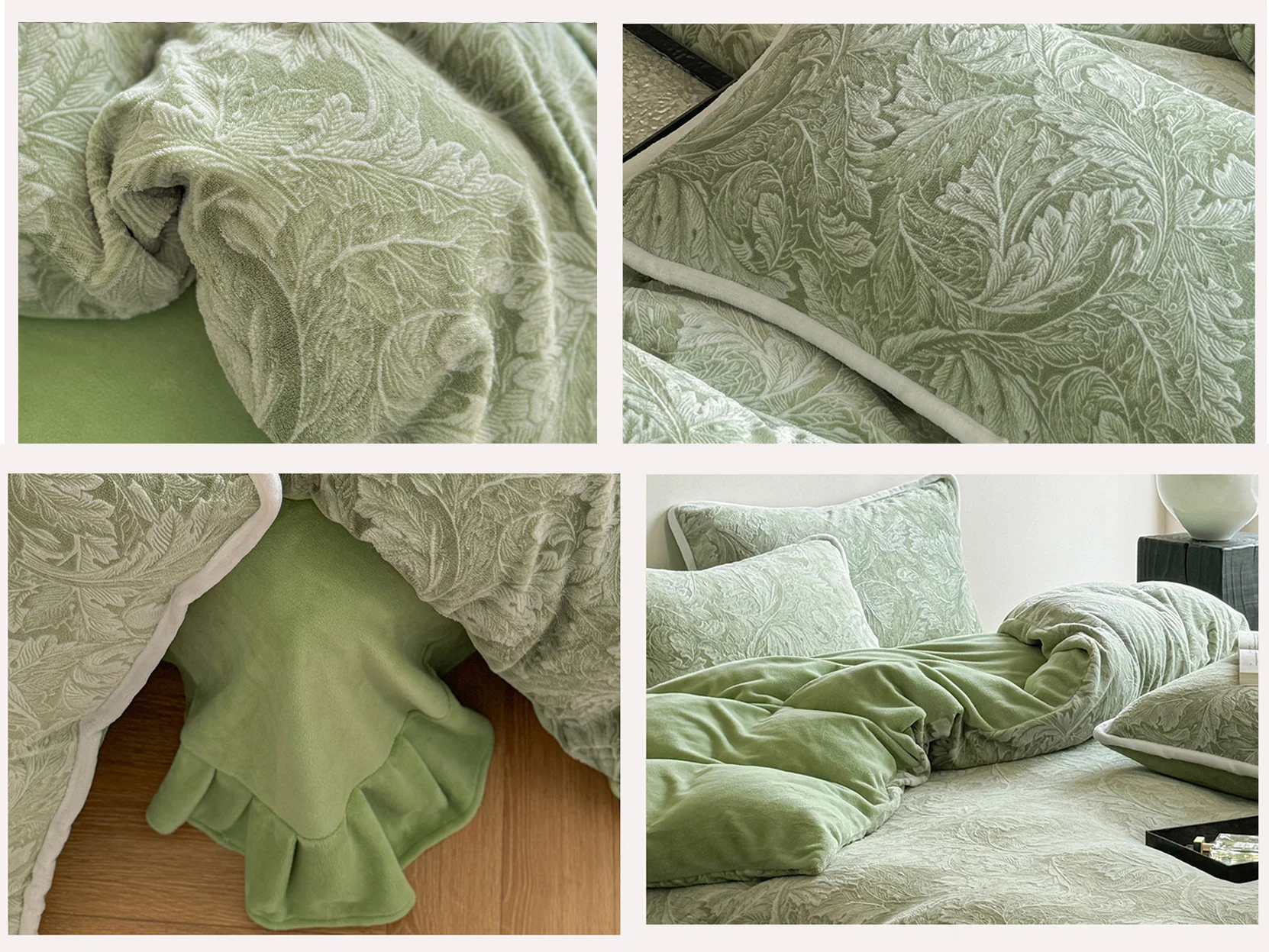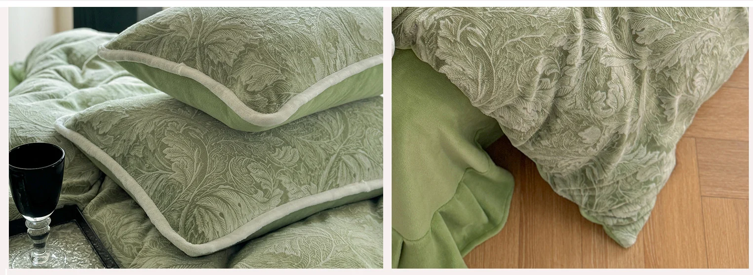 Shaggy Duvet Cover: The tufted floral green king size duvet cover has a 220GSM sculpted velvet fabric on one side, design of the pattern and 3D process present a simple bohemian style. The 200GSM velvet duvet cover on the reverse side creating an effective warmth circulation system that traps heat and ensures your bed stays cozy