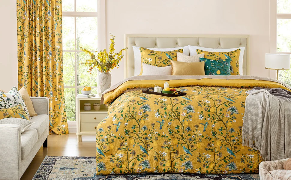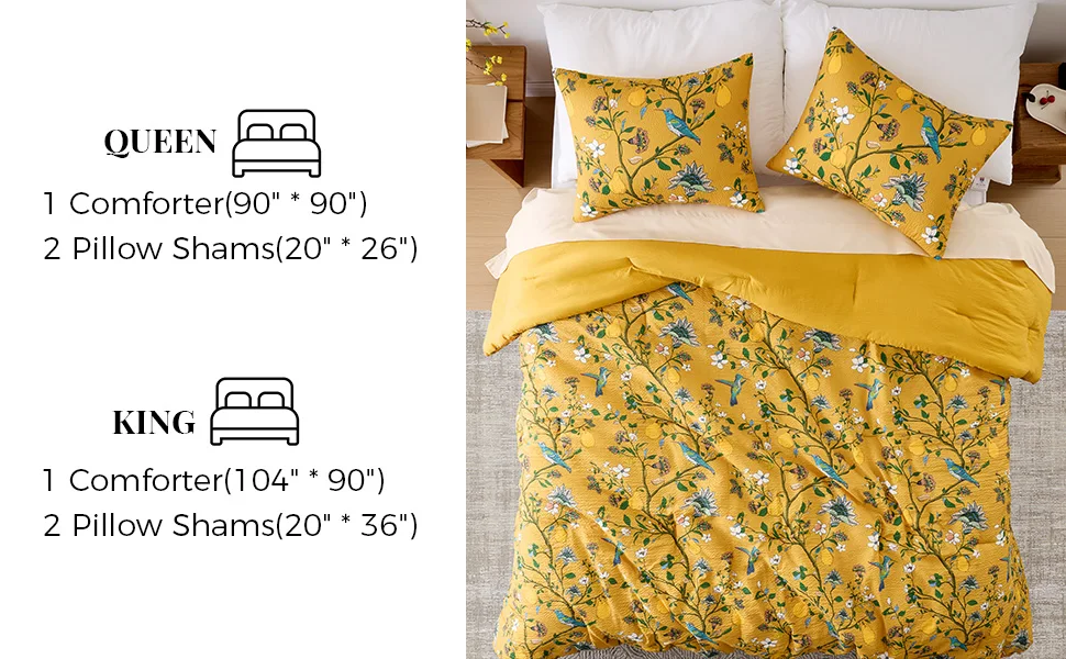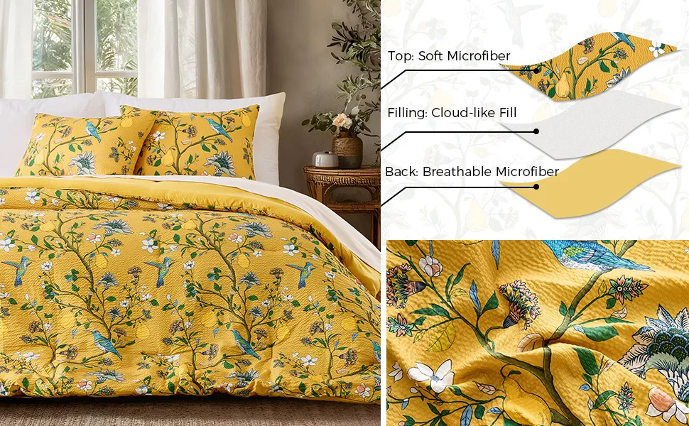Yellow Bedding Queen Comforter Set 3 Pieces Vintage Botanical Floral Pattern Bed Comforter Sets Boho Whimsical Modern Bedroom