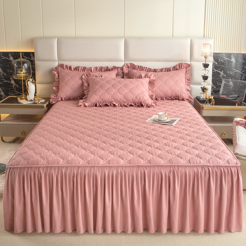 Ruffled Bed Skirt Solid Non-Slip Mattress Dust-Proof Cover Chic Farmhouse Style Lightweight 3 Pcs Set with Pillowcases Bed Skirt