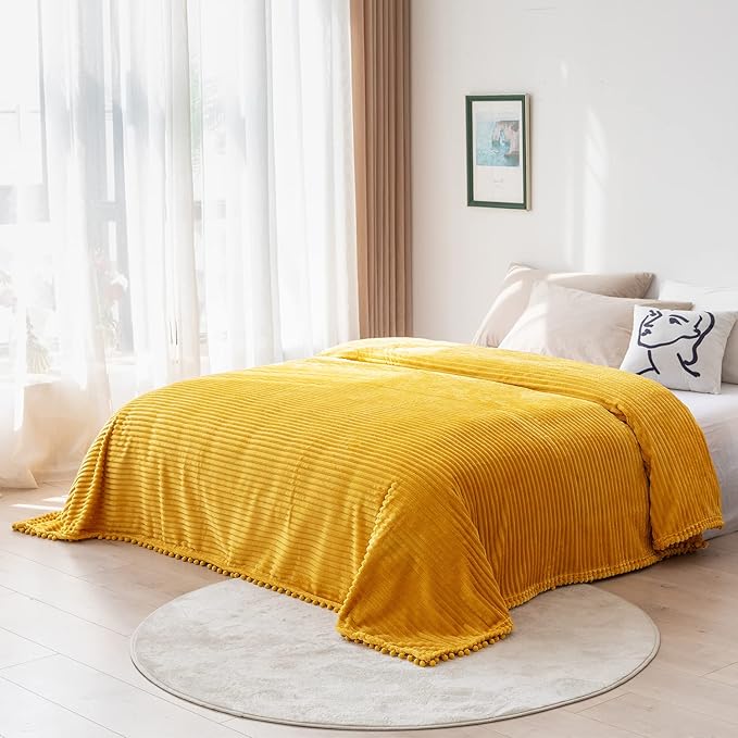【Pompom & Strip Design】- Flannel fabric with pompoms fringe around the blanket, different color and white stripe pattern with 3D touching offers you amazing senses of softness. The fabulous color revives this blanket with an elegant appearance to complement your room a chic feeling.