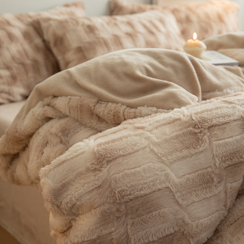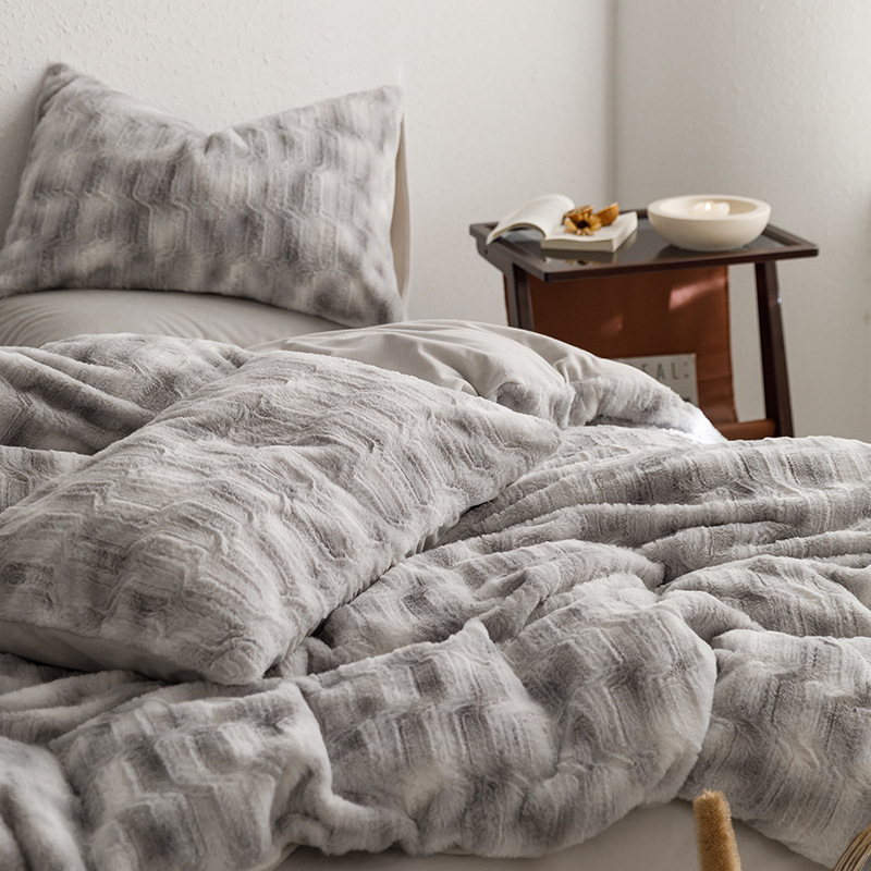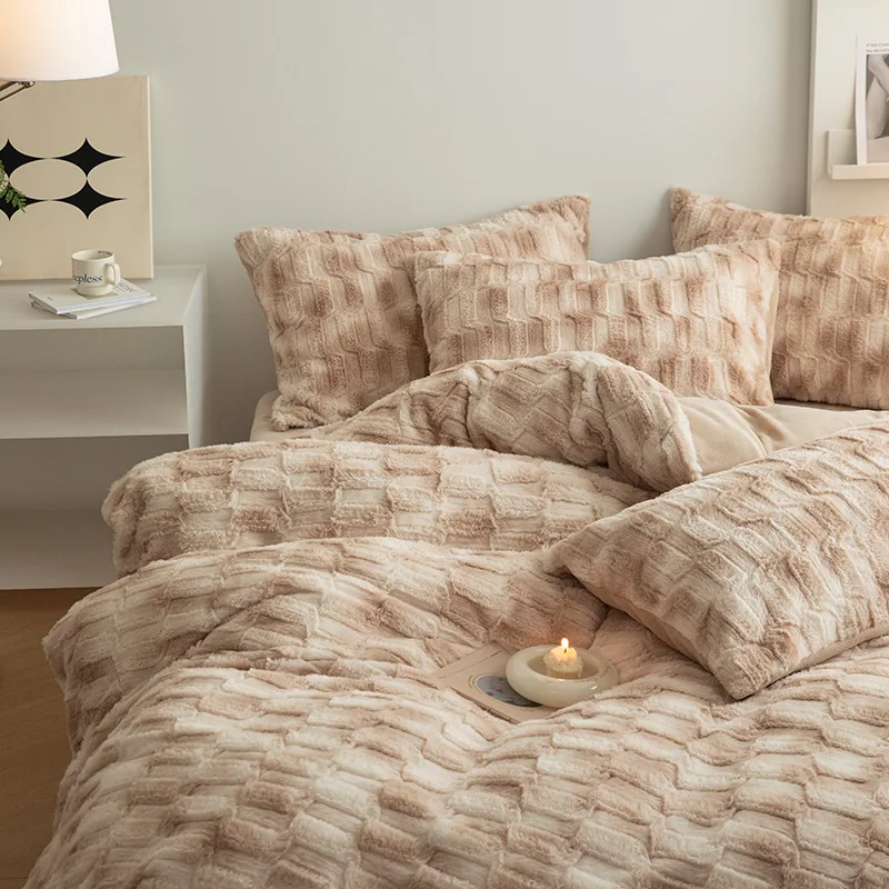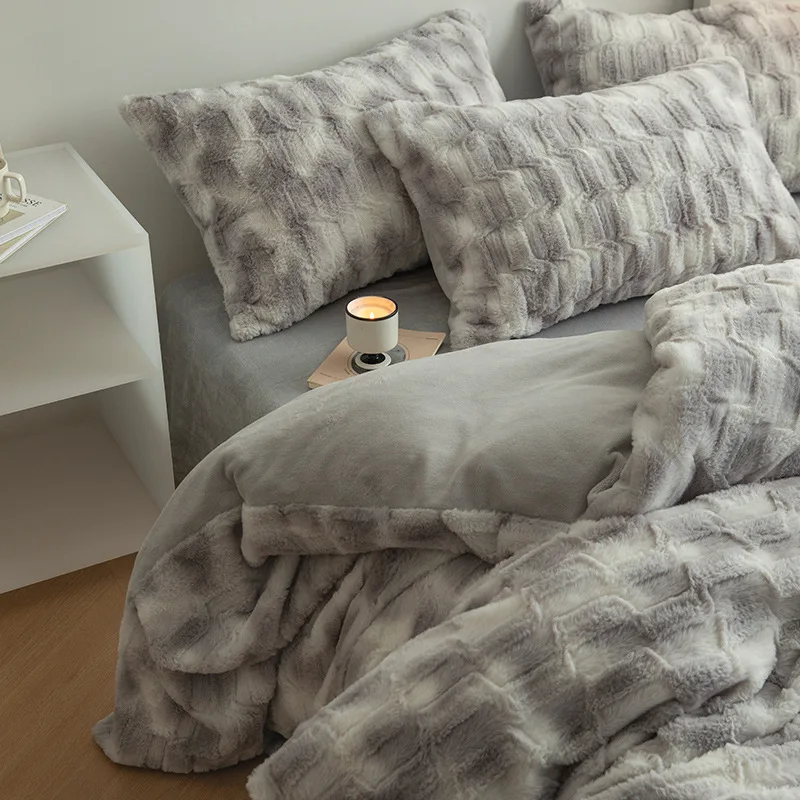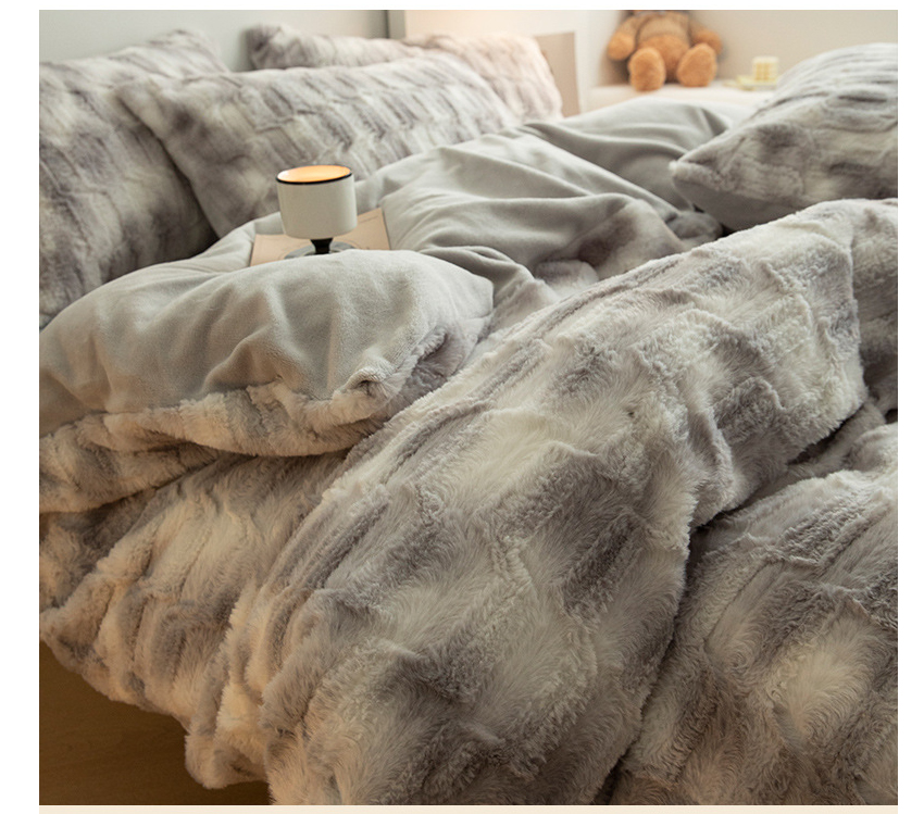 Cozy Warmth: The Flannel+Rabbit Fluff Faux Fur Comforter Set boasts a super comfy fuzzy texture, like cats sleep around you. The filling is down-alternative which provides a warm and comfortable sleep experience.