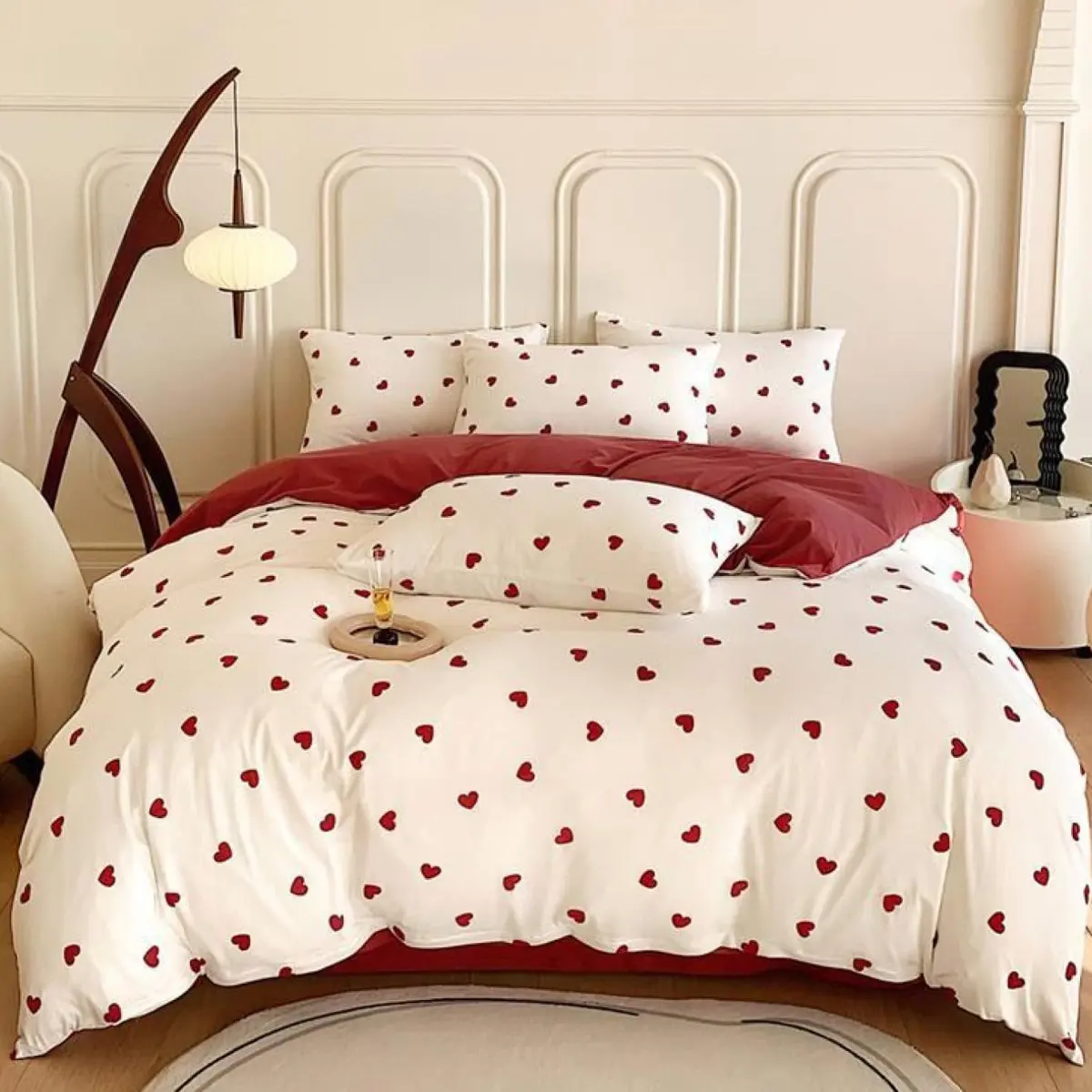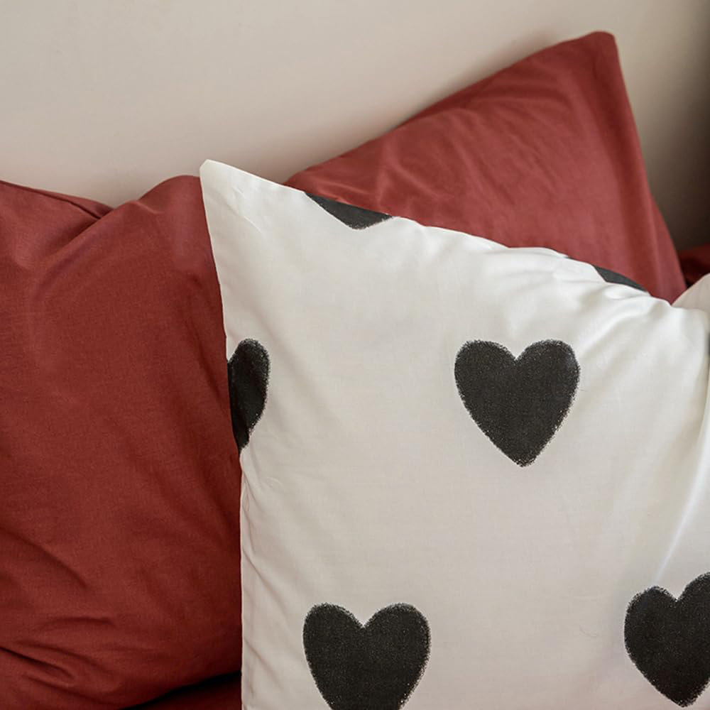 Design: Red And White Double-Sided Bed Linen Set, White Bedding With A Beautiful Black Heart-Shaped Pattern.