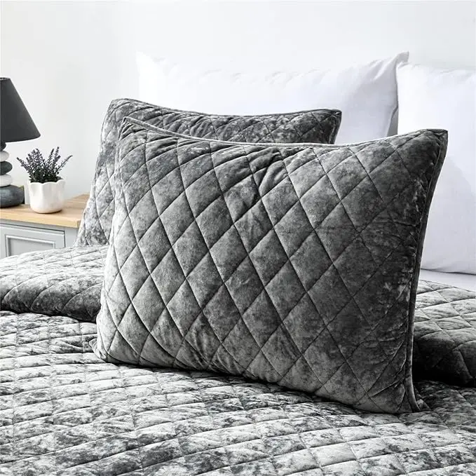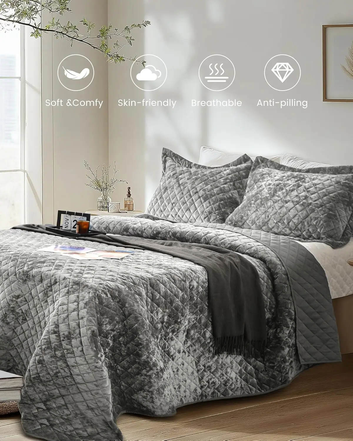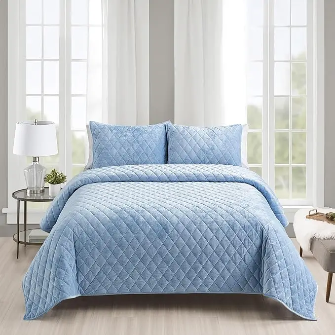 Material&Filling: This Quilt Set Is Made Of 100% Polyester Distressed Velvet For The Face And Brushed Microfiber Fabric For The Reverse. Both Fabrics Are Finished For Super Soft Handfeel. The Fill Is Made Of Light Weight Down Alternative Polyester. With Diamond Quilting Pattern. This Quilt Set Is Light Weight And Warm, Suitable For All Seasons.