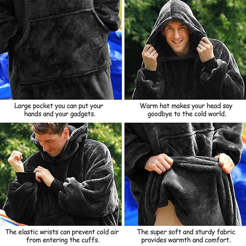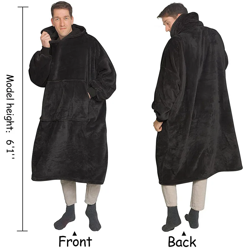 Design Ideal: People often use blankets to withstand the cold weather, but blankets can only cover one side and don’t have many different simultaneous connection points to the body, causing the blanket to slide down from time to time and let the wind in. Our warm wearable blanket solves this problem well. Blanket hoodie is big and soft which can wrap you up from head to toe and protect you from the cold wind