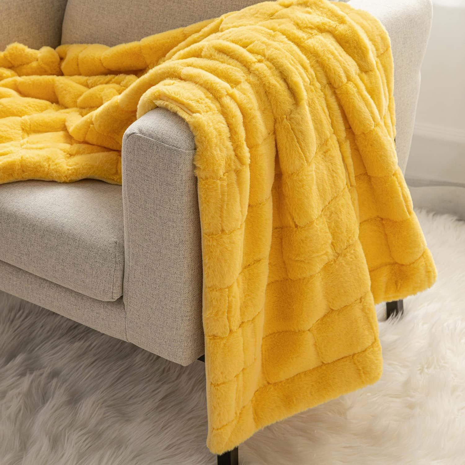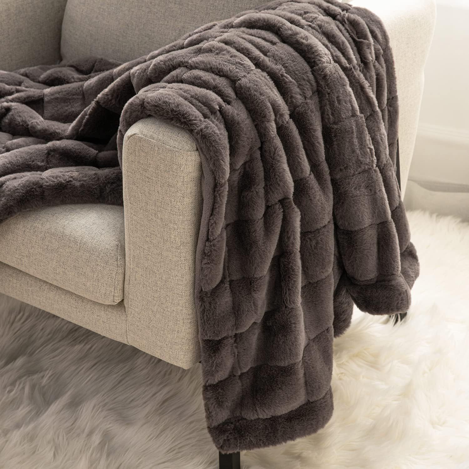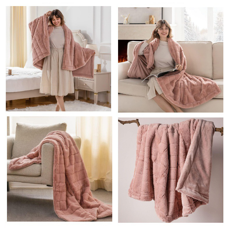 Unique 3D Check Design: This plush faux rabbit fur blanket showcases an intricate 3D check pattern with reinforced seams to prevent unraveling, the exquisite design perfectly blends elegance with modern minimalist style, adding a touch of luxury to your home decor.