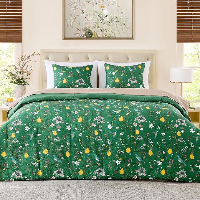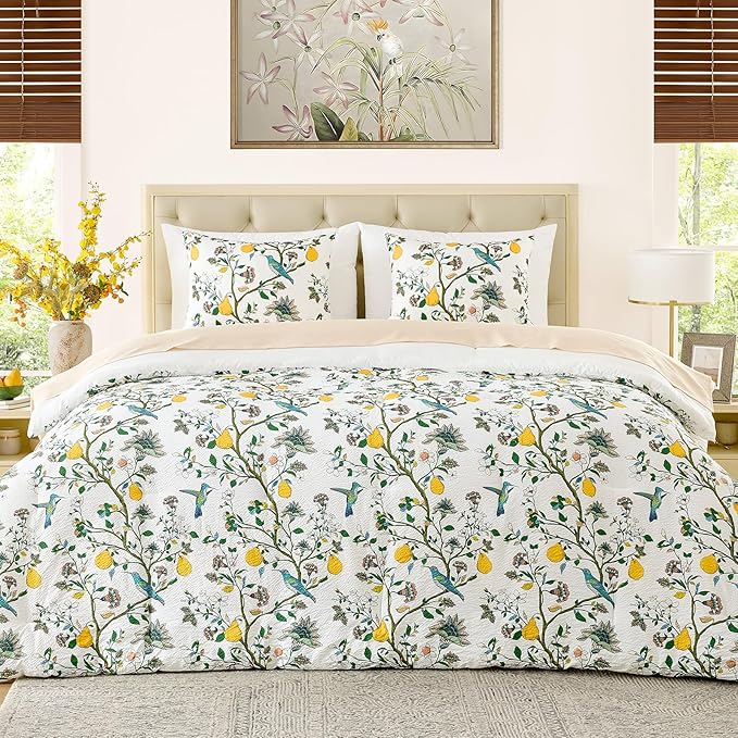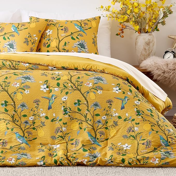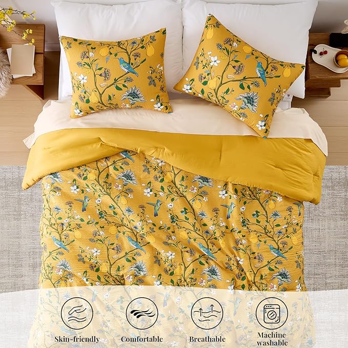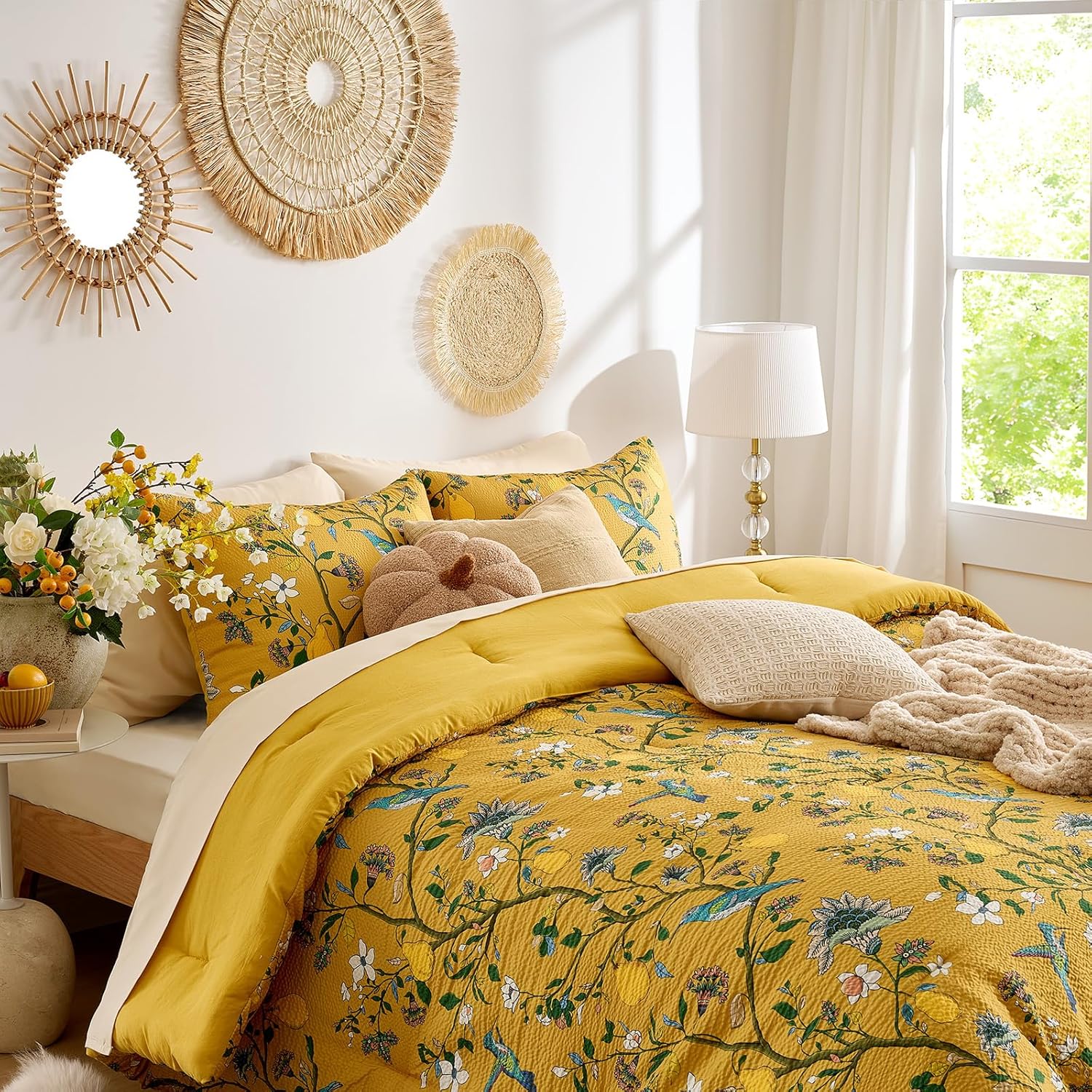 Yellow Bedding Queen Comforter Set 3 Pieces Vintage Botanical Floral Pattern Bed Comforter Sets Boho Whimsical Modern Bedroom