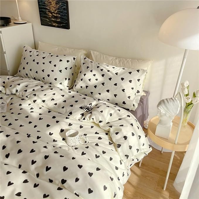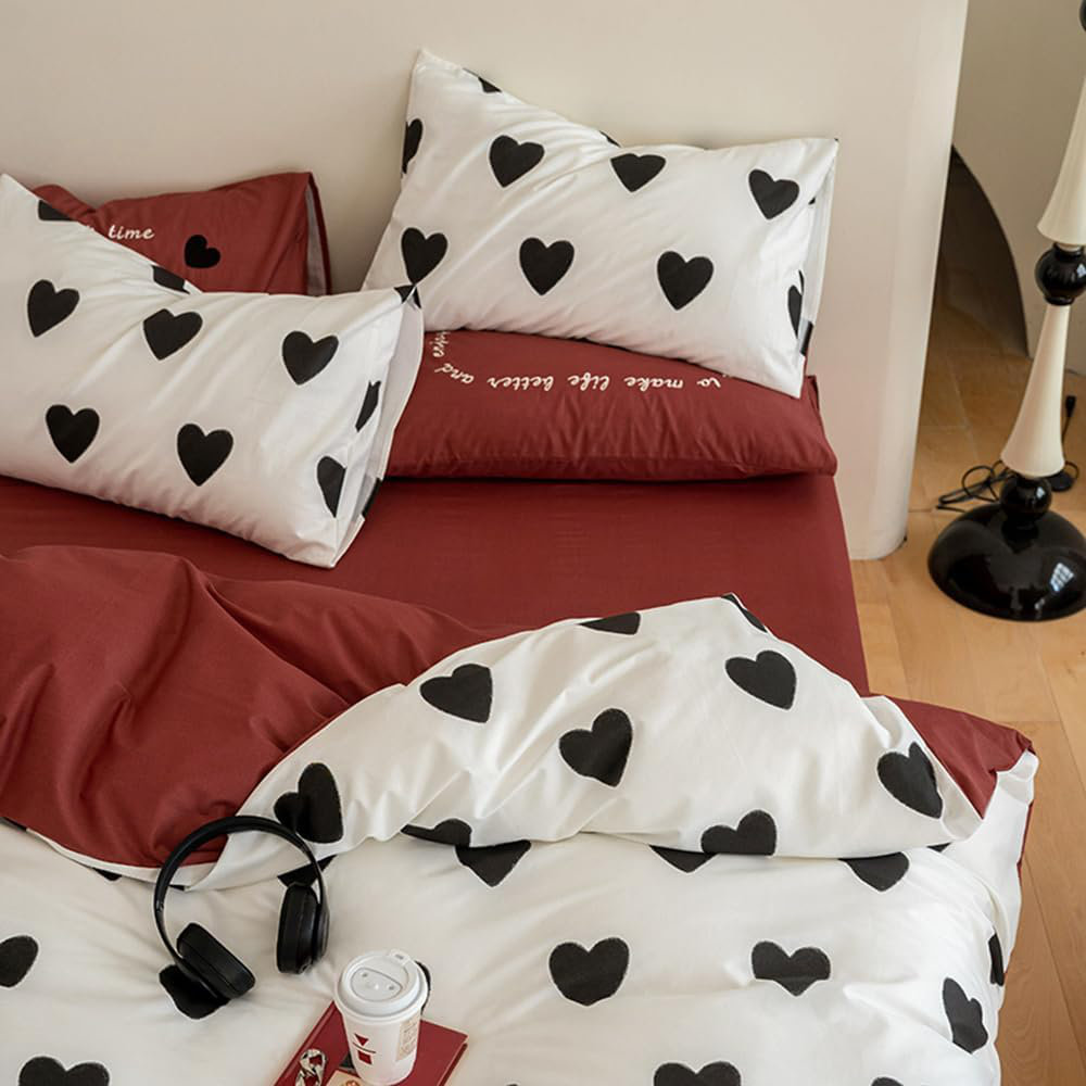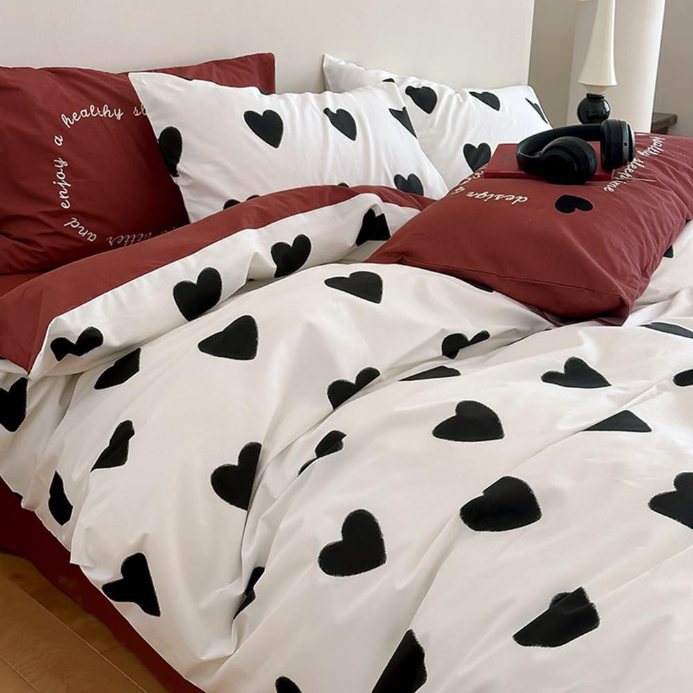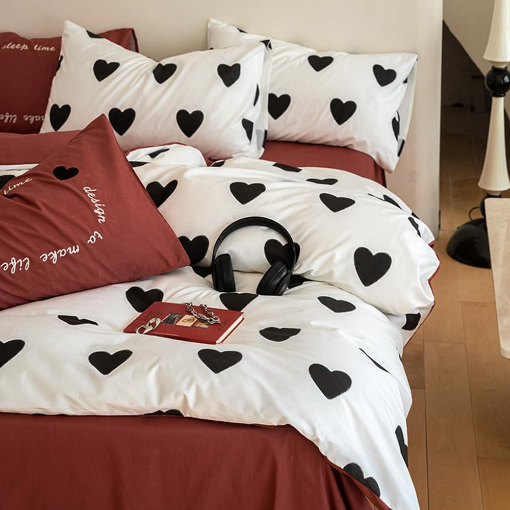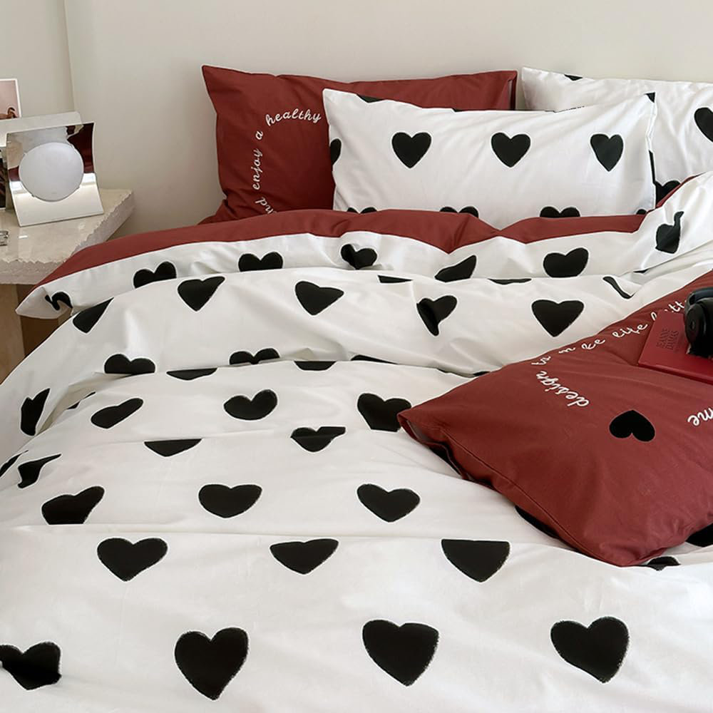 Design: Red And White Double-Sided Bed Linen Set, White Bedding With A Beautiful Black Heart-Shaped Pattern.
